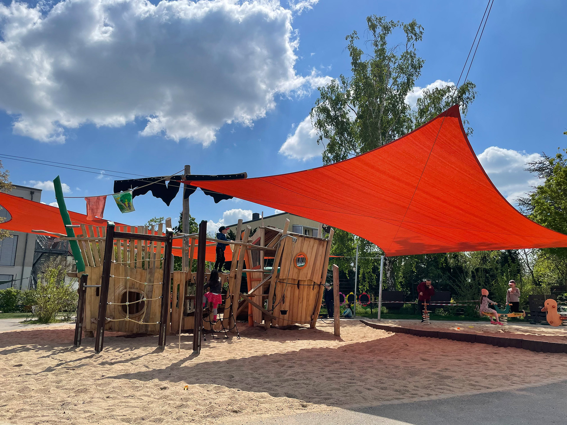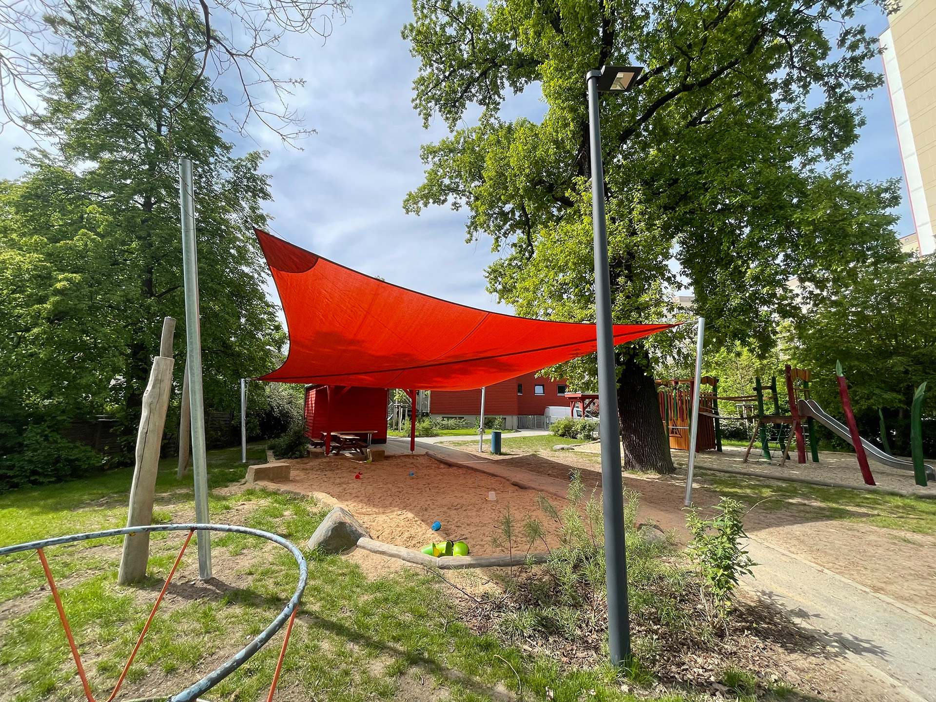 Unsere Sandkasten-Lösungen sind so robust geplant, dass sie die gesamte Kindheit überdauern. Dank höhenverstellbarer Masten lässt sich das Segel flexibel anpassen – heute als Sonnenschutz über dem Sand, morgen als coole Chill-Ecke für Schulkinder.