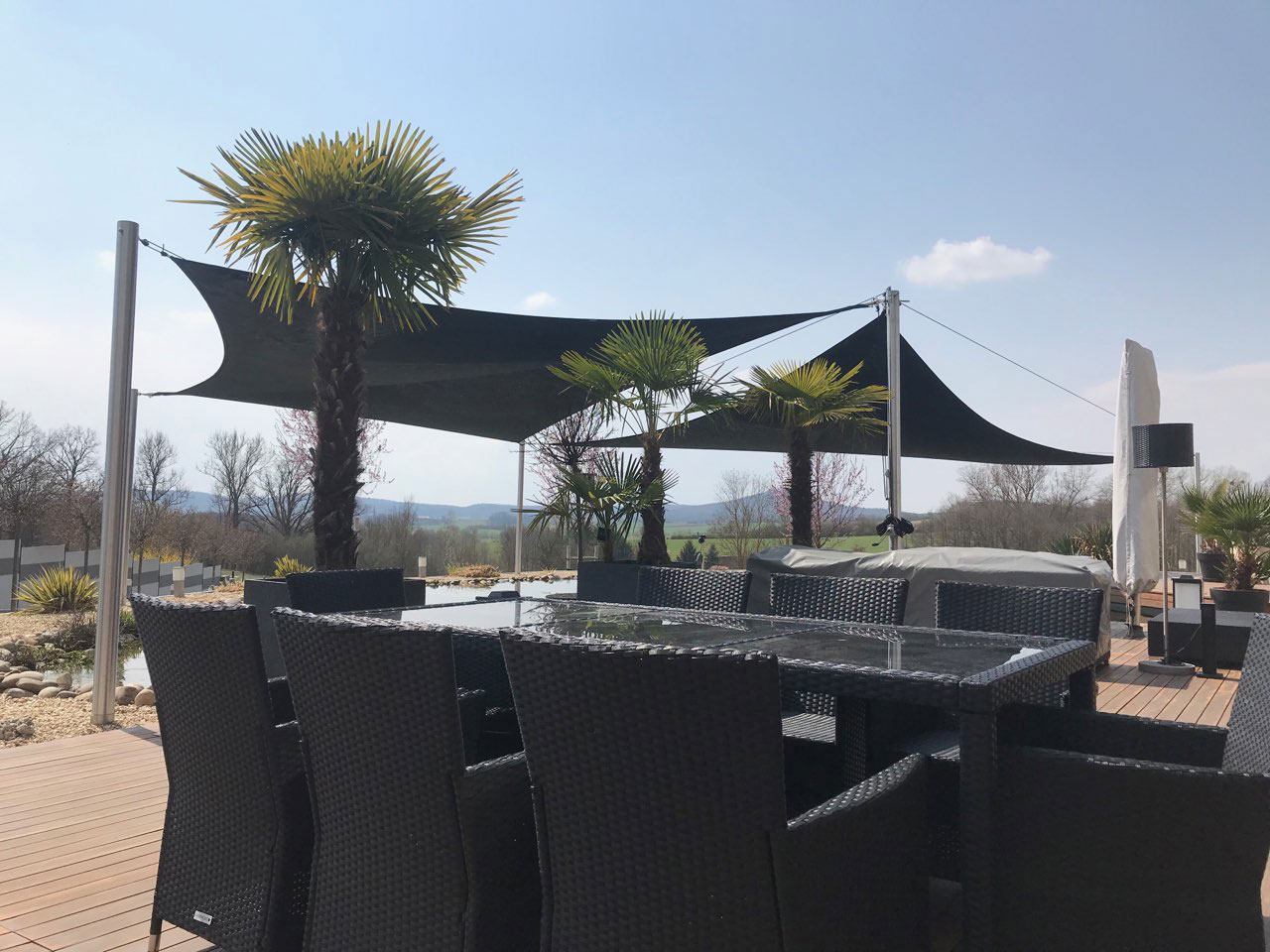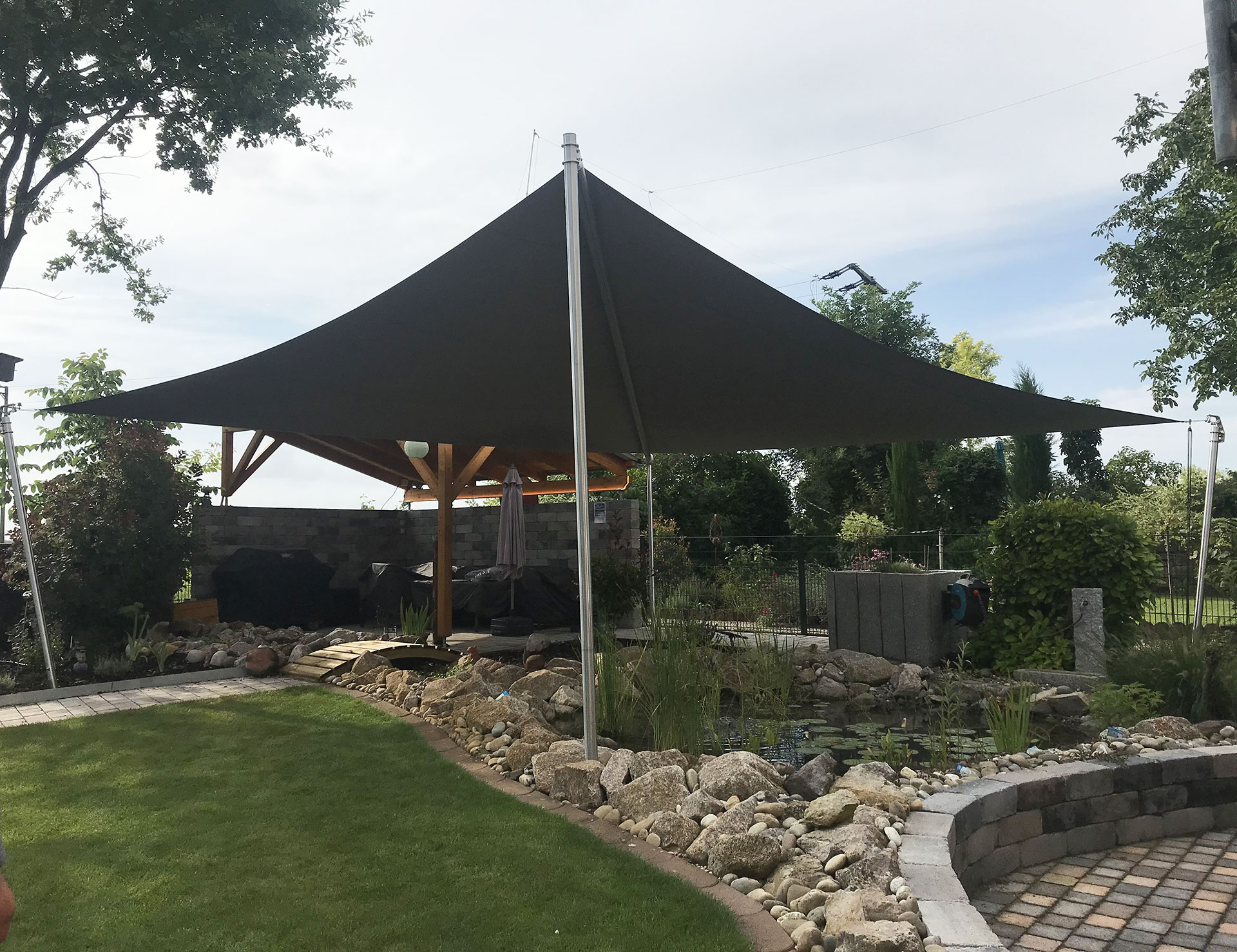 Besonders bei kleineren Teichen heizt sich das Wasser im Sommer extrem auf. Unsere Sonnensegel wirken wie eine natürliche Klimaanlage und halten die Temperatur in einem für Flora und Fauna verträglichen Bereich.